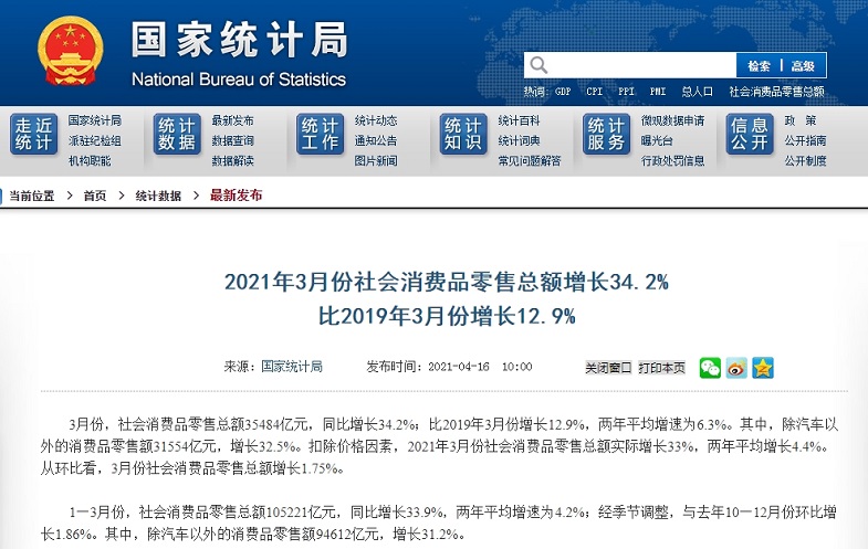 国家统计局 一季度社会消费品零售总额亿元同比增长33 9 中国网客户端